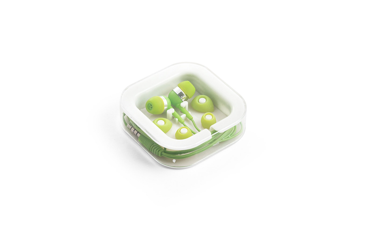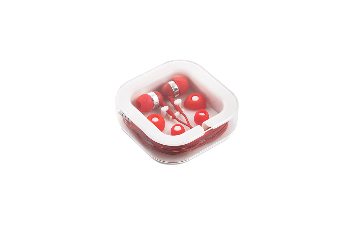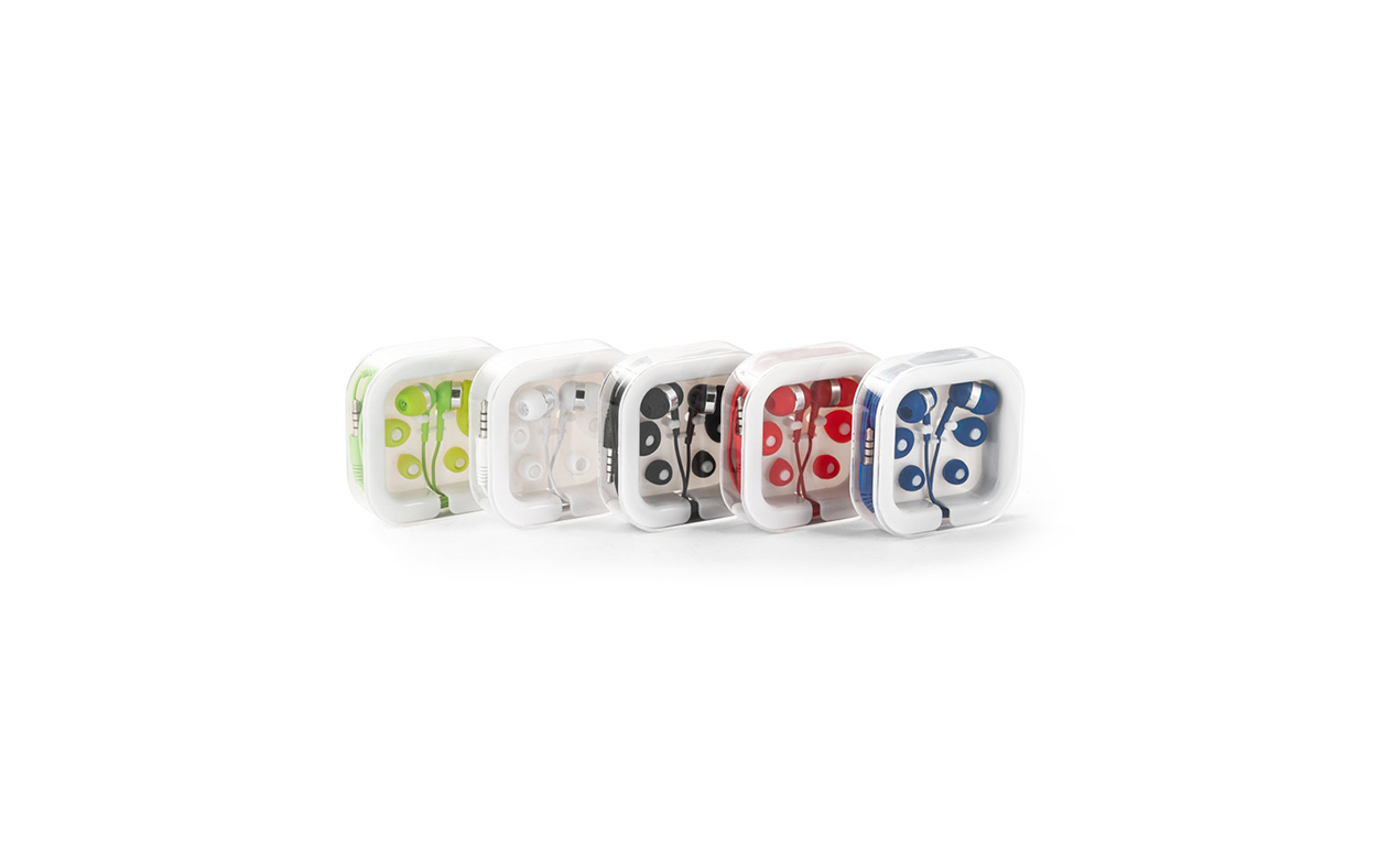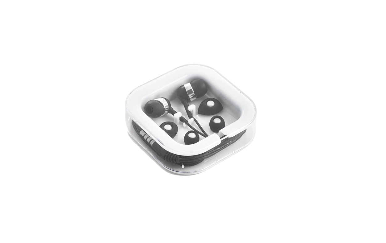 Auriculares de 120 cm con micrófono incorporado. Cuenta con conexión estéreo de 3,5mm. Incluye 2 pares adicionales de adaptadores de silicona para los oídos (dos tamaños diferentes). Se suministra en caja de PS y ABS. Medidas: 7 x 7 x 1,8 cm
