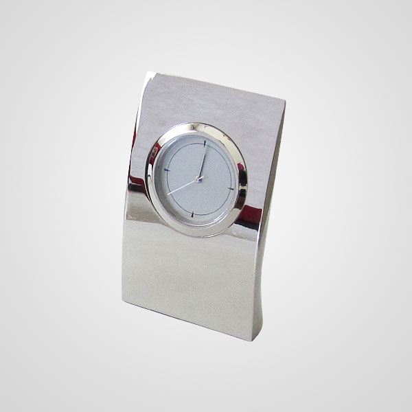 Descripción: Reloj de escritorio análogo curvo metálico, terminación en cromo.