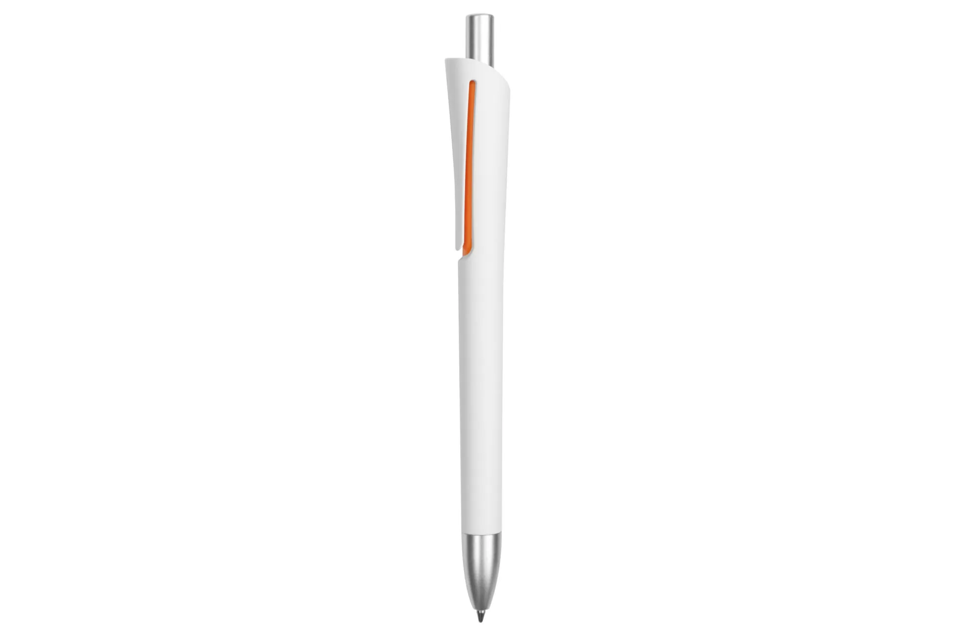Plástico. Cuerpo blanco mate. Clip, puntera y pulsador color plata. Debajo del clip detalle de color. Tinta azul.