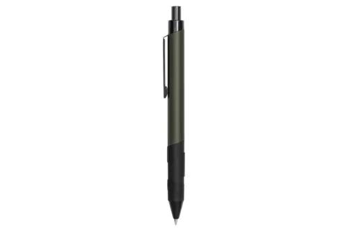 Metálico. Pulsador y puntera de plástico negro. Clip metálico en color negro. Grip de goma negro. Cuerpo de color. Tinta negra.