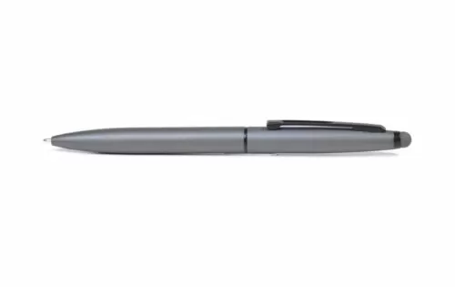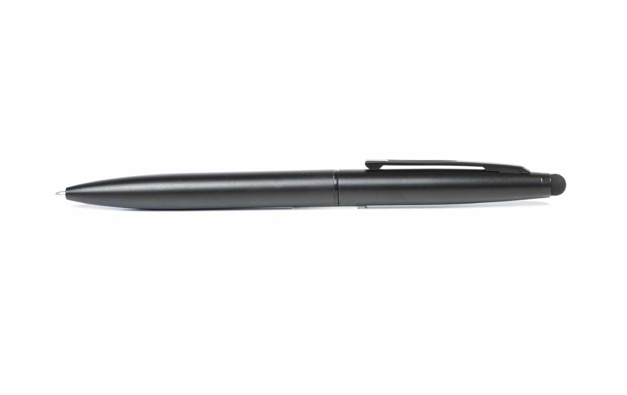 Bolígrafo cuerpo de aluminio con acabado mate, base color plateada para impresión láser. Clip metálico en negro y con touch del color del cuerpo. Medio giro. Tinta negra. Trazo: 1.0 mm