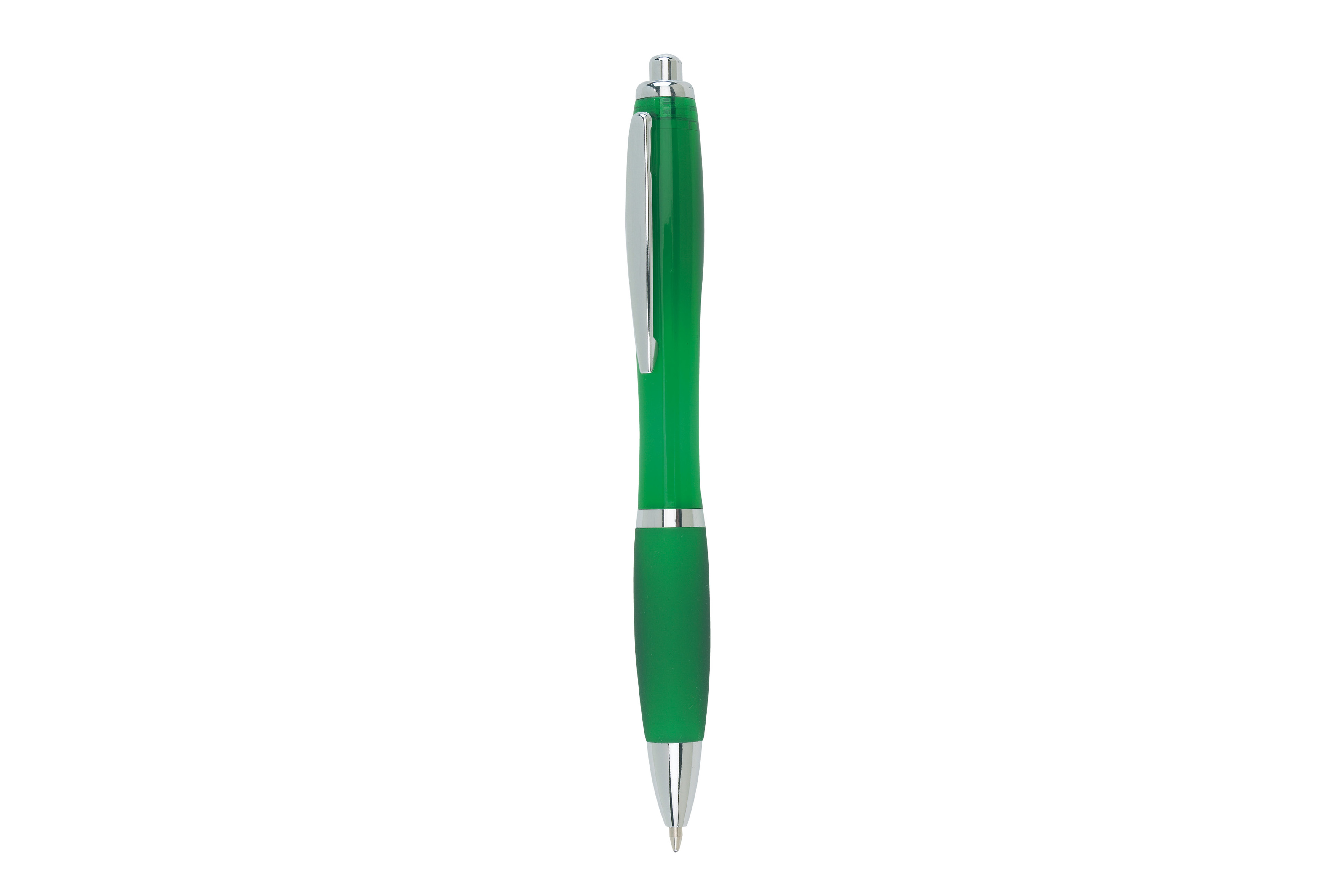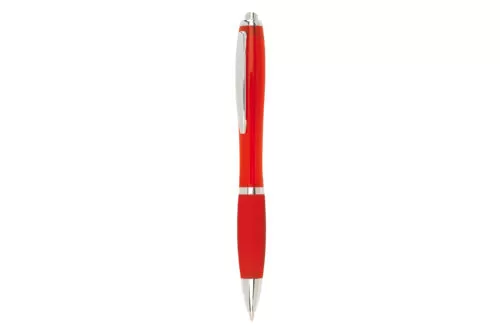 Plástico. Cuerpo curvo. Pulsador, clip, puntera y detalles en color plata. Grip de goma de color. Retráctil. Tinta negra.