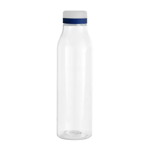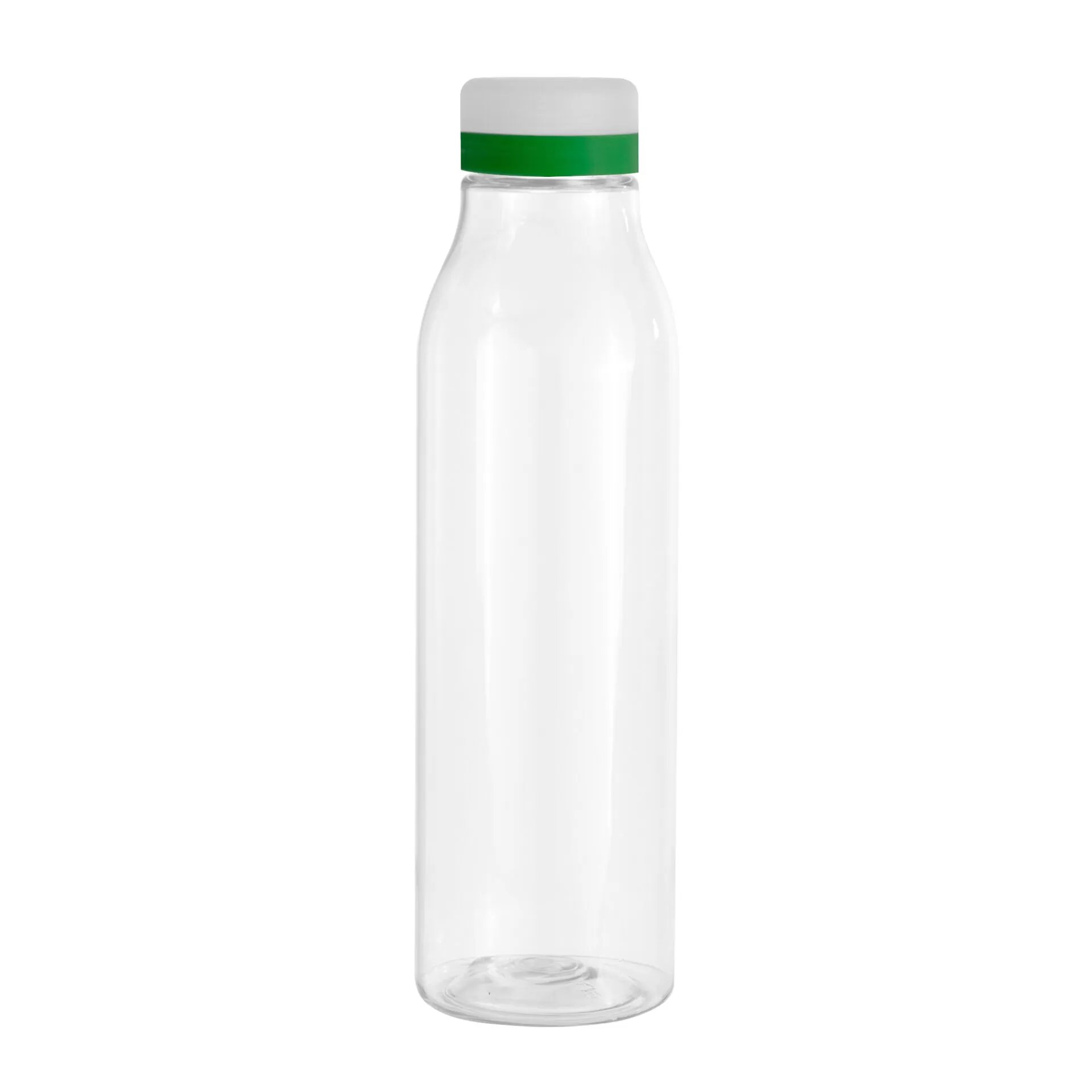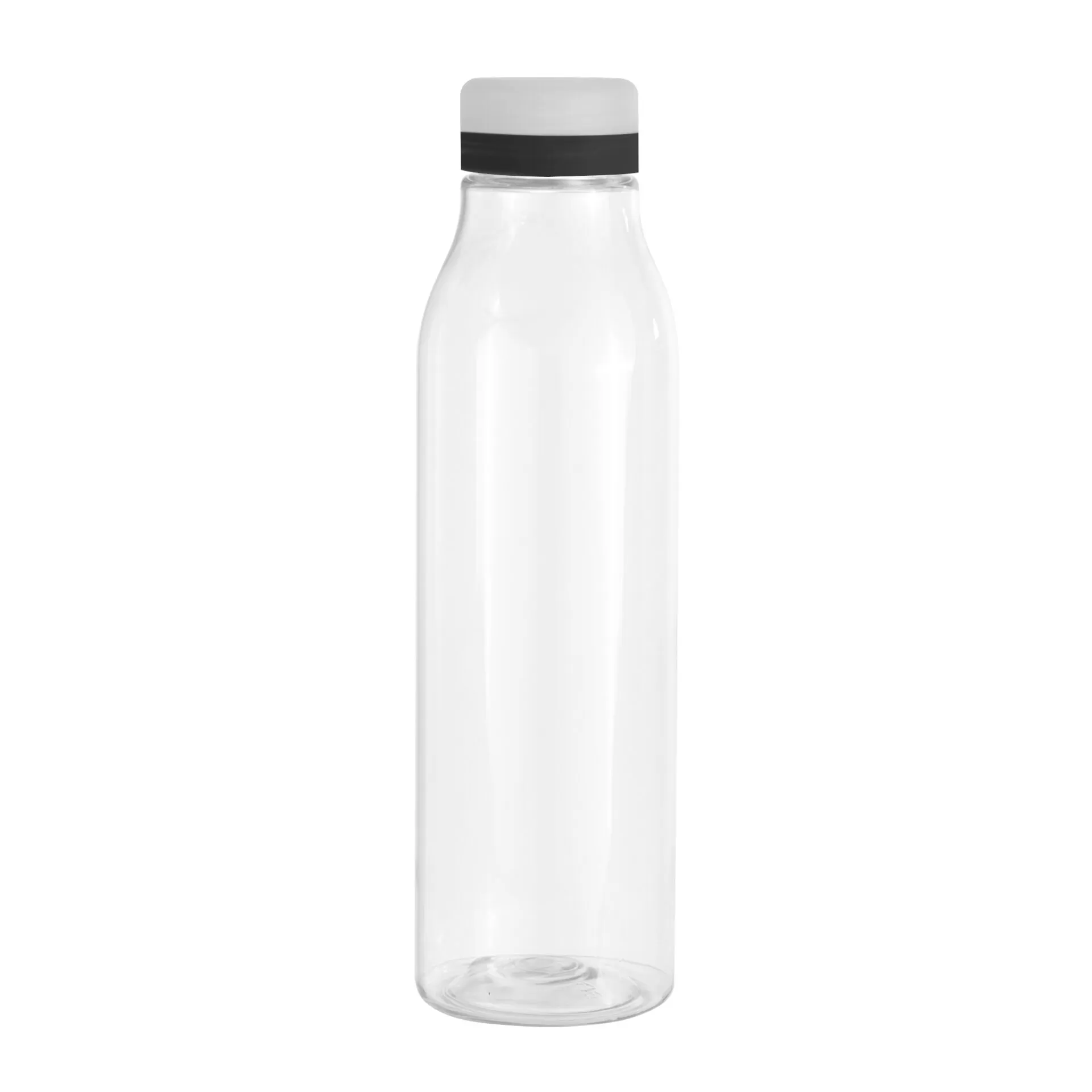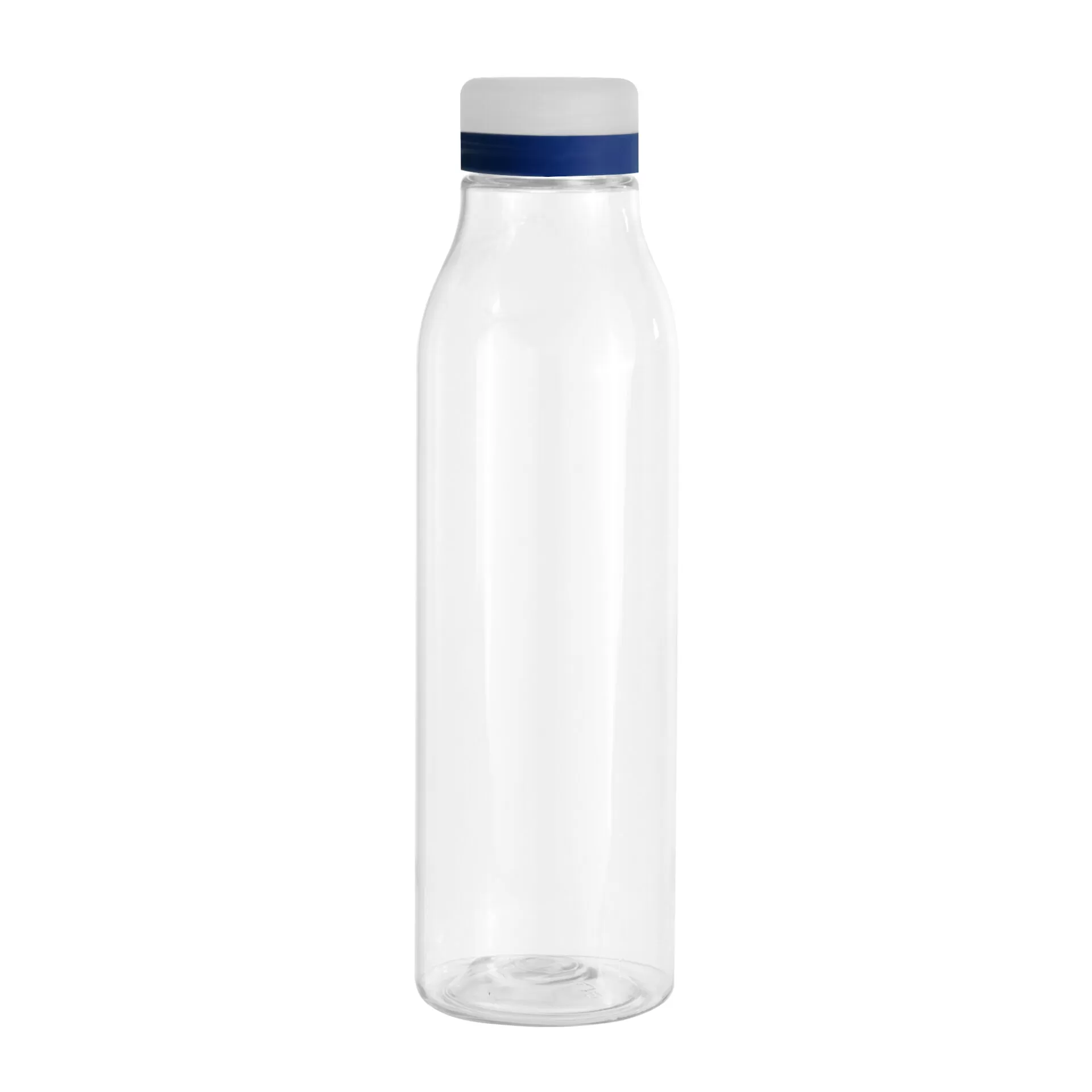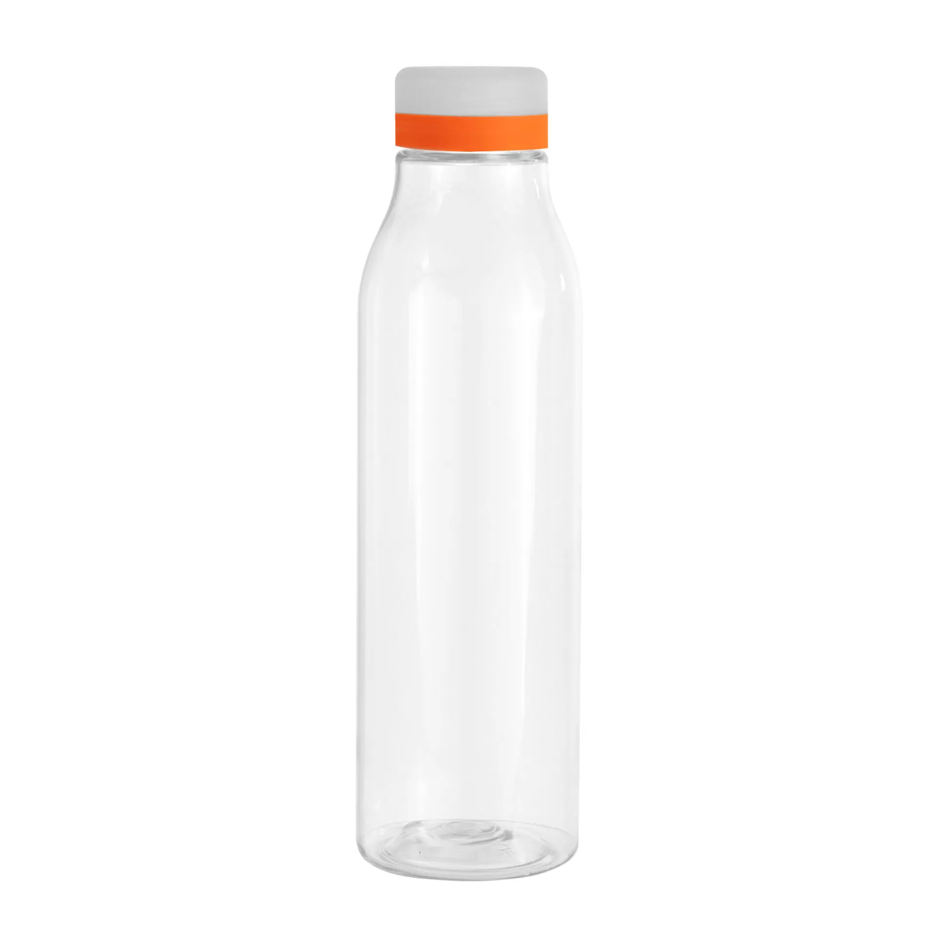 Frescura a tu lado.Botella de plástico transparente con tapa a rosca esmerilada con anillo de silicona de diferentes colores.Medidas: Ø 7 x 24,5 cm.