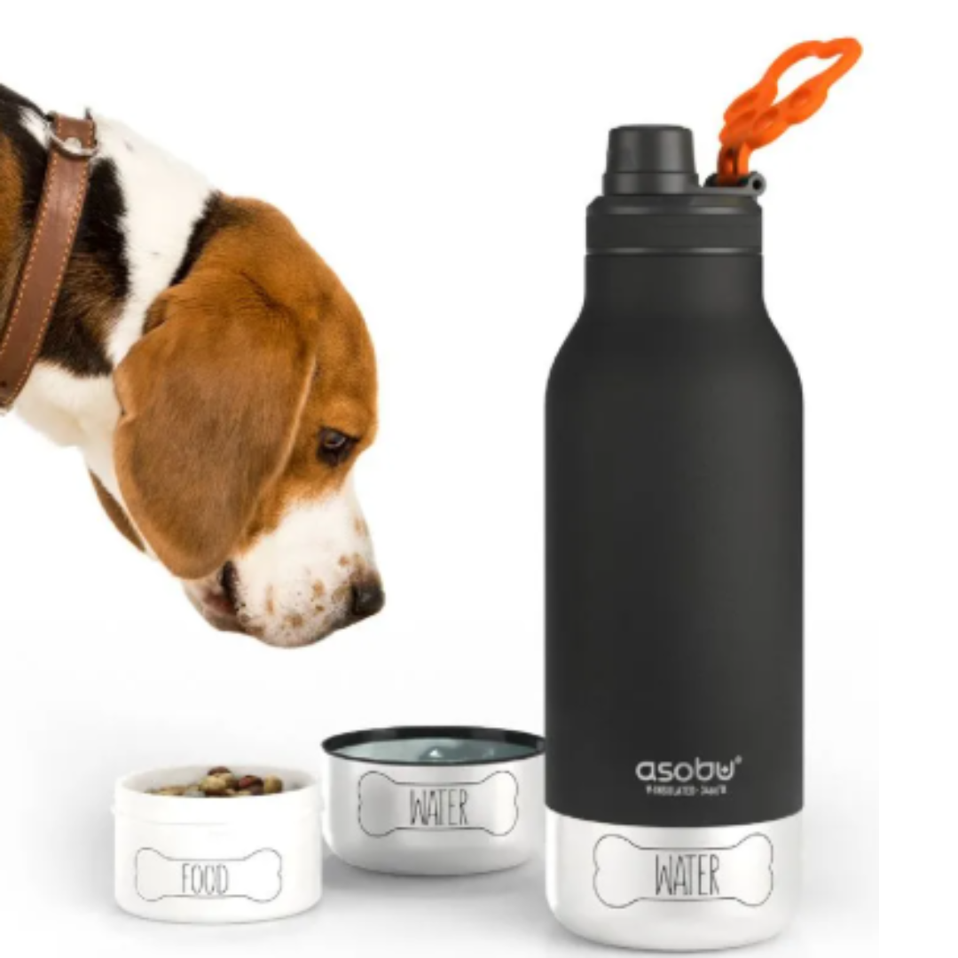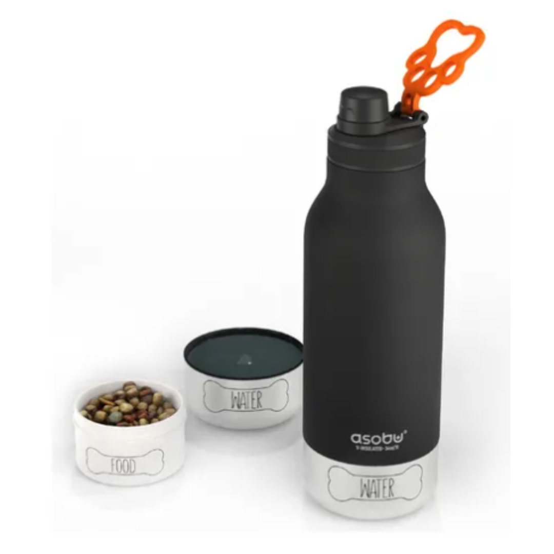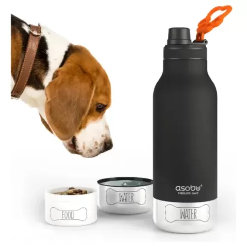 La botella de acero inoxidable con aislamiento térmico mantiene al agua fría por horas, y además incluye dos pequeños platos para colocar agua y alimento para tu amigo de cuatro patas.