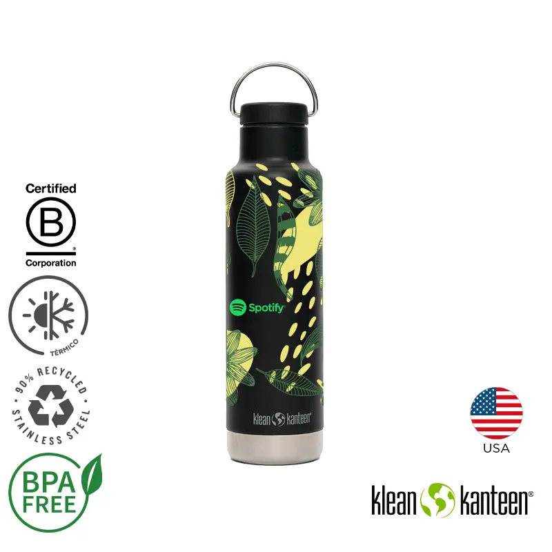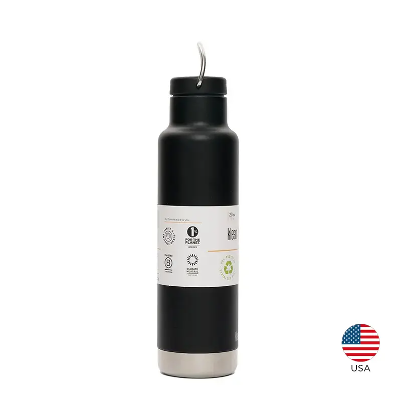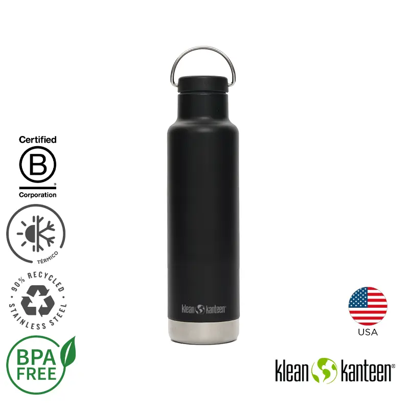 Botella térmica de 592 ml fabricada en doble pared de acero inoxidable, manteniendo las bebidas calientes durante 24 horas y frías durante 63 horas. Exterior en polvo Klean Coat, resistente a las astillas, es duradero y seguro para las personas y el planeta.