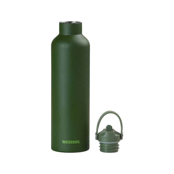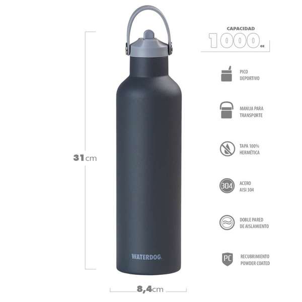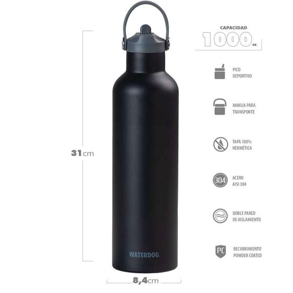 Botella térmica Waterdog Hydro1000. Composición: Acero AISI304. Aprobadas por INAL. Capacidad: 1000ml. Alto: 31 cm. Peso: 0,451 kg. Diámetro base: 8,4 cm. Diámetro boca: 5 cm. Recubrimiento Power Coated. Doble pared aislante. Tapa hermética a rosca. Manija para transporte.