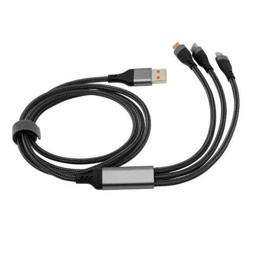 Carga al instante, vive sin límites.Cable de carga rápida. Entrada 2 en 1: USB y USB-C. Salida: USB-C, microUSB y lightning. Max 20V 3A. Color gun con toques naranjas en cada conector. Precinto de velcro fijada al cable. Medidas: 120 cm. (extendido).