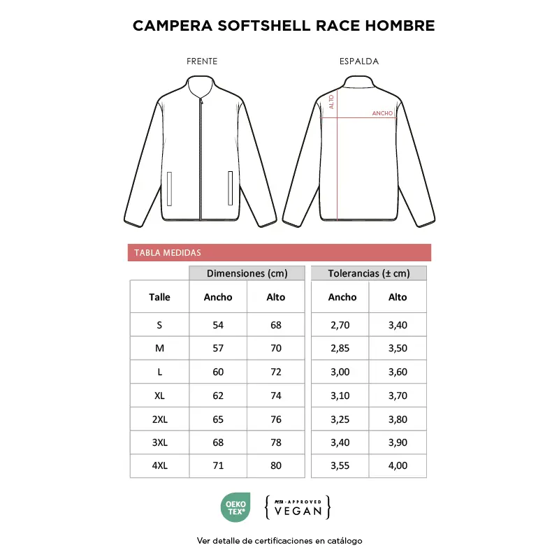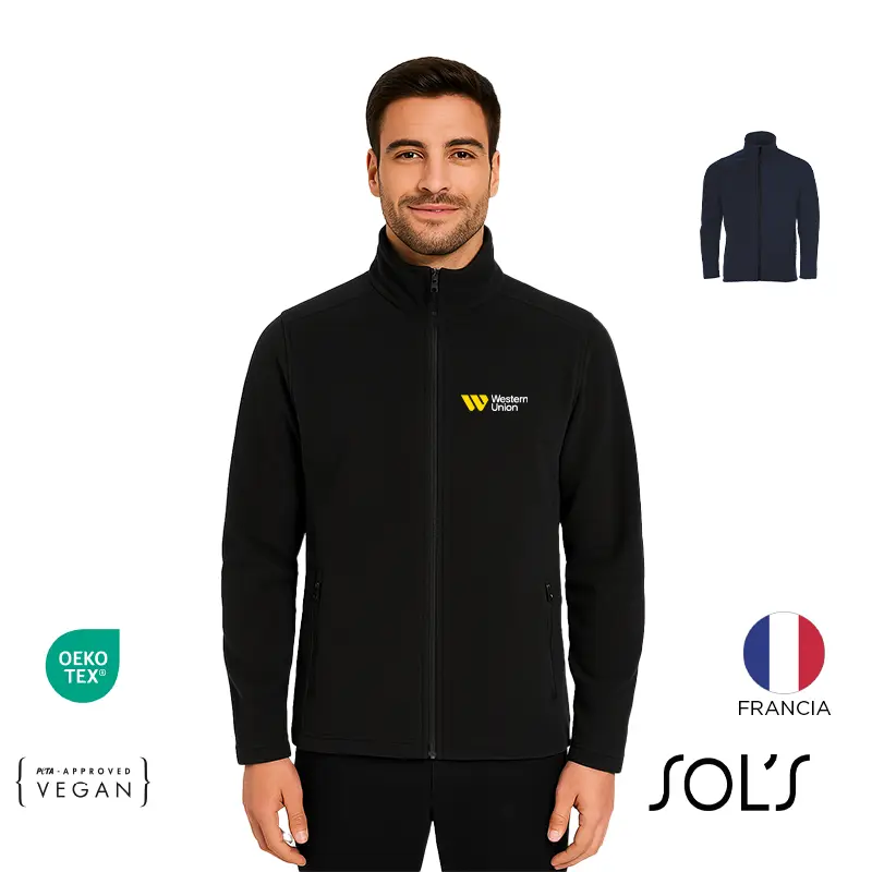 Campera de softshell 280g 96% poliéster 4% elastáno con tela exterior impermeable e interior de polar. Cuenta con 2 bolsillos laterales con cierre. CERTIFICACIÓN: PETA-Approved Vegan. RECOMENDACIONES DE USO: Lavar a máquina a 40°. No lavar en seco. No blanquear. No planchar. No secar en máquina. Consultar términos y condiciones del servicio. Sol´s.