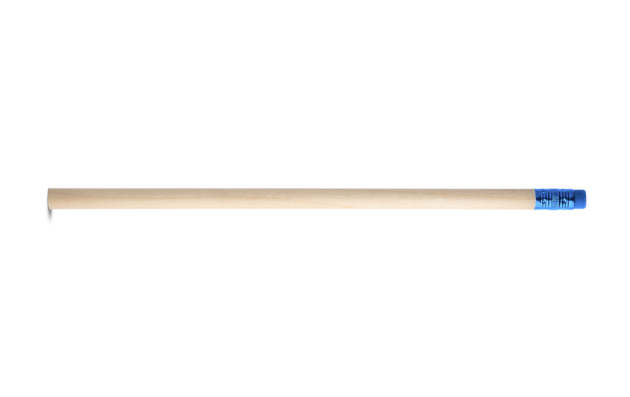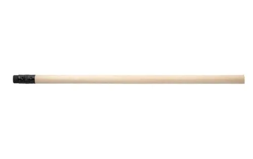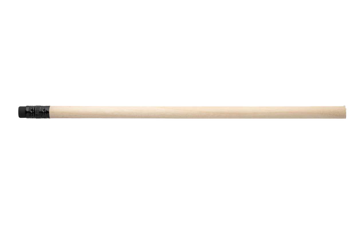 Lápiz ecológico de madera y grafito. Incluye en la parte superior una goma negra recubierta por una férula de metal del mismo color. Tiene una graduación HB y se entrega sin punta. Medidas : ø0,7 x 19 cm