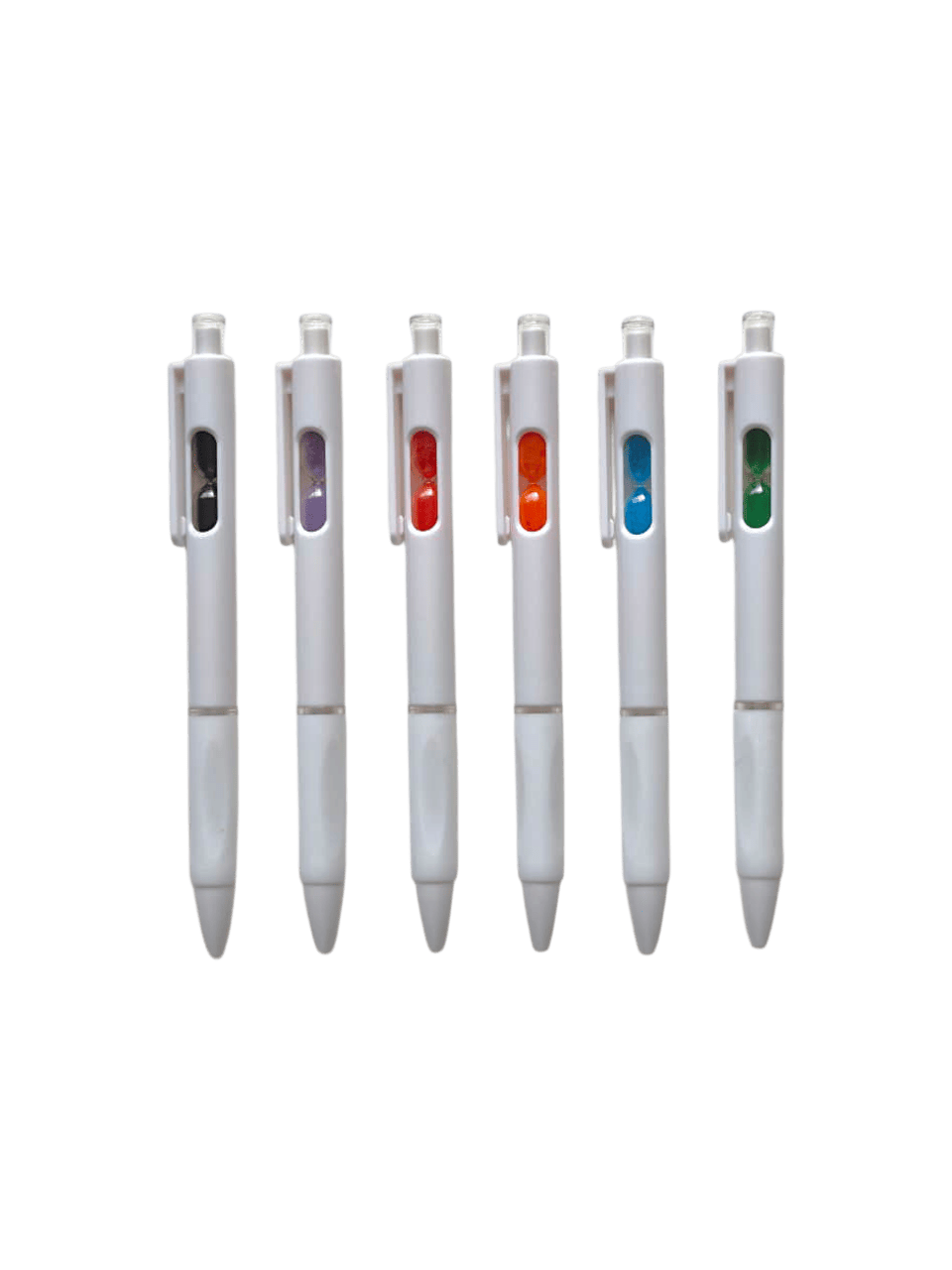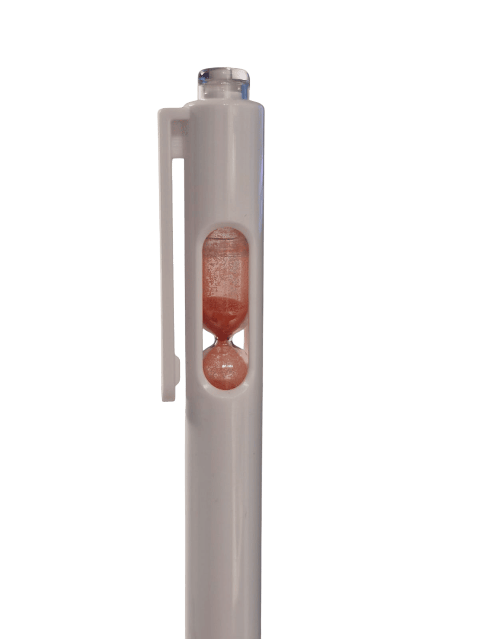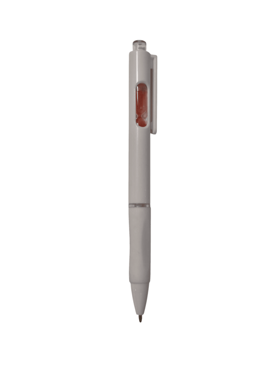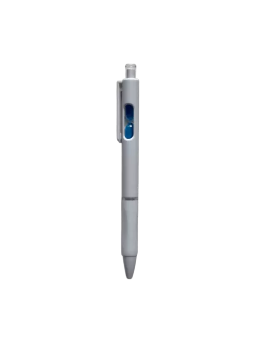 Bolígrafo retráctil con un pequeño reloj de arena en el interior. Cuerpo blanco, grip de goma, clip cristal y arena en varios colores.