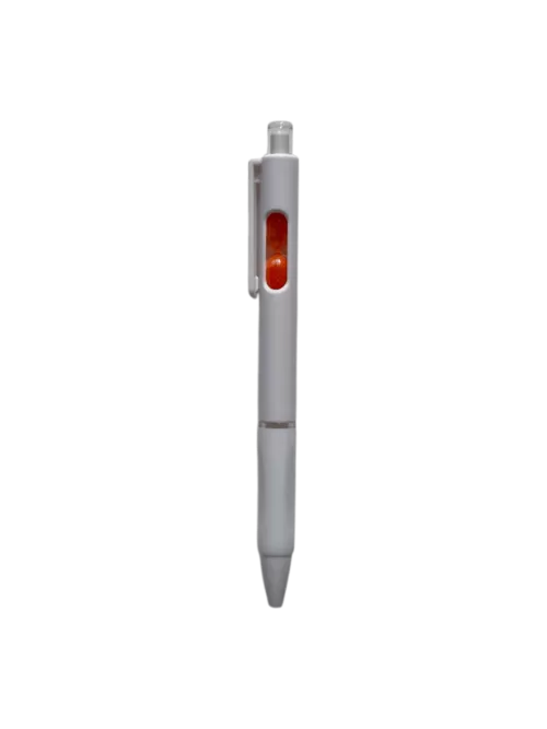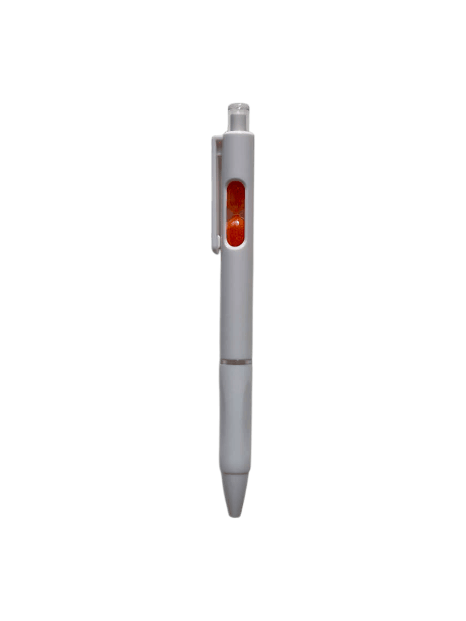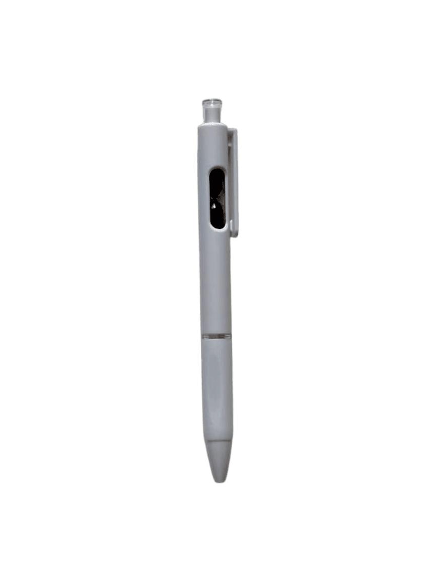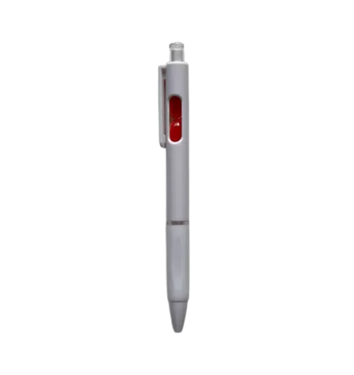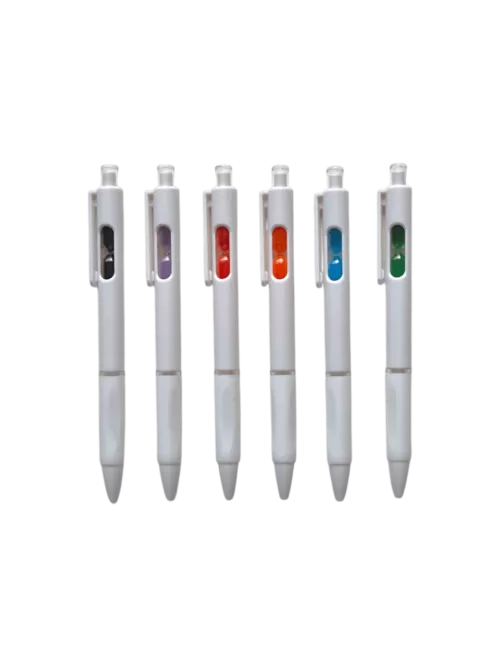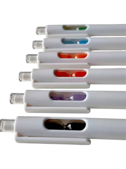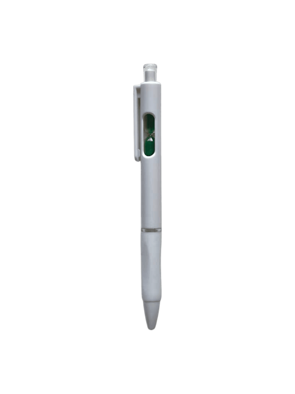 Bolígrafo retráctil con un pequeño reloj de arena en el interior. Cuerpo blanco, grip de goma, clip cristal y arena en varios colores.