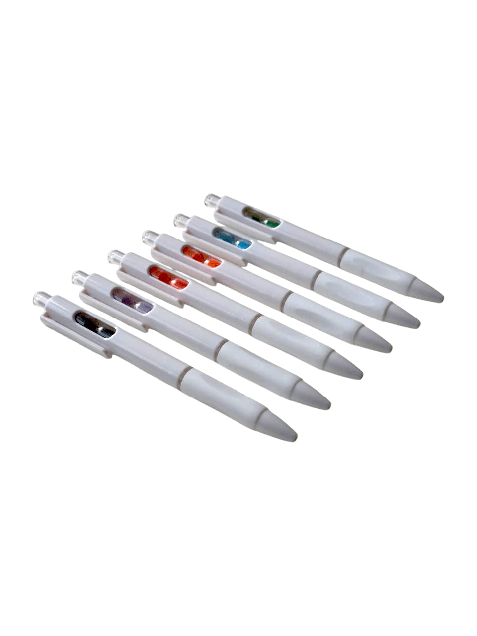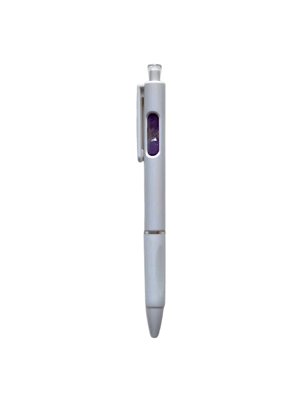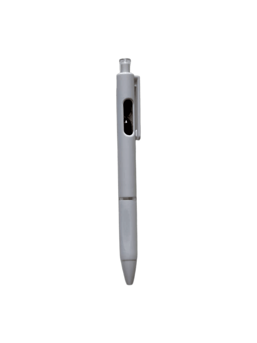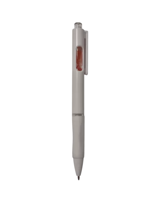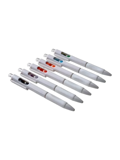 Bolígrafo retráctil con un pequeño reloj de arena en el interior. Cuerpo blanco, grip de goma, clip cristal y arena en varios colores.
