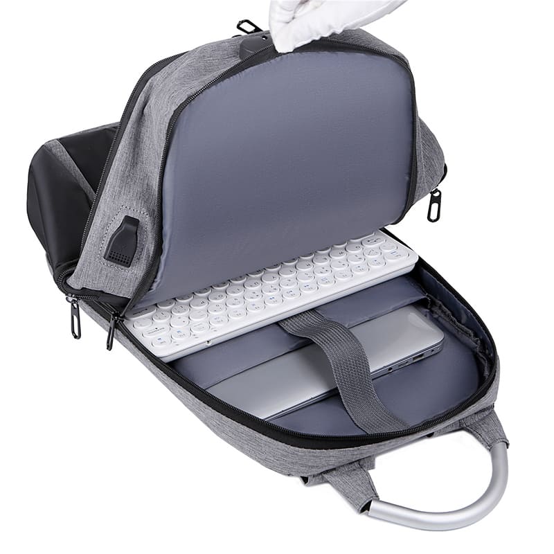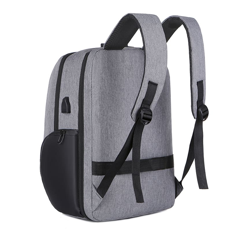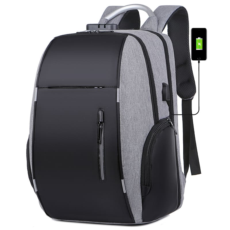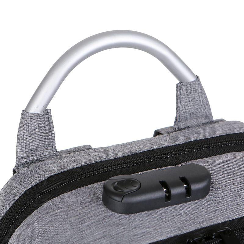 DESCRIPCIÓN: Presenta dos bolsillos en el frente, uno vertical de fácil acceso y uno horizontal oculto para acceder a uno de mayor tamaño. Luego dos compartimientos, el primero con un cierre doble y candado con tres porta objetos hacia el frente y salida externa USB con cable para conexión interna. En el segundo, también con cierre doble que contiene sobre el sector de la espalda el bolsillo porta notebook con sujetador con velcro con capacidad para introducir una notebook de hasta 17″. En ambos laterales posee dos bolsillos con cierre.