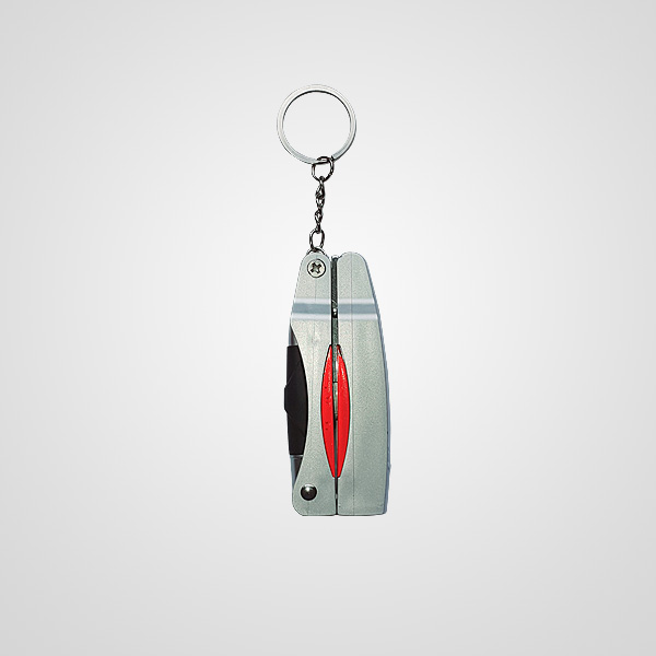 Desplegable con linterna y bolígrafo incorporados. Posee aro llavero.