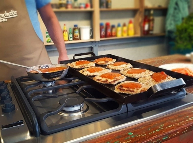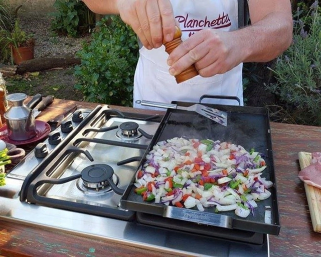 La Planchetta para 2 hornallas es un equipamiento de cocina profesional para uso doméstico. Puede ser utilizada sobre cualquier tipo de calor (hornalla, cocina eléctrica, carbón, fuego,etc.). Cociná de un modo simple, rápido y económico.