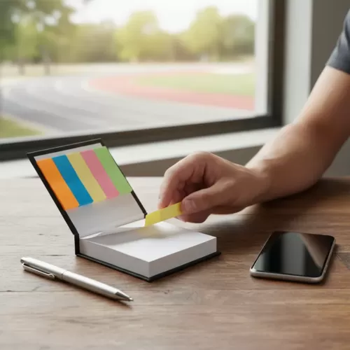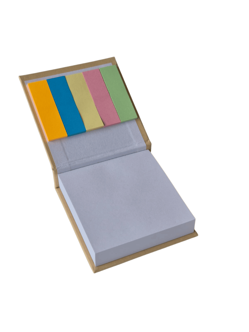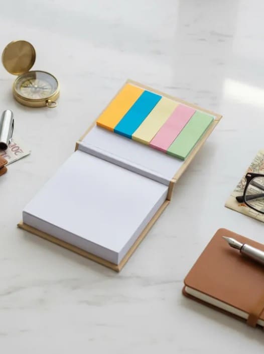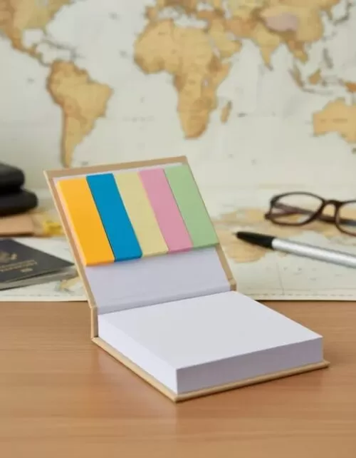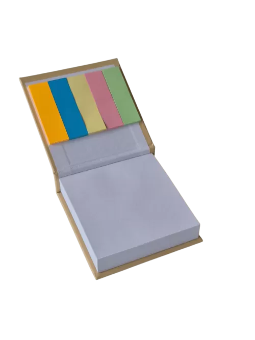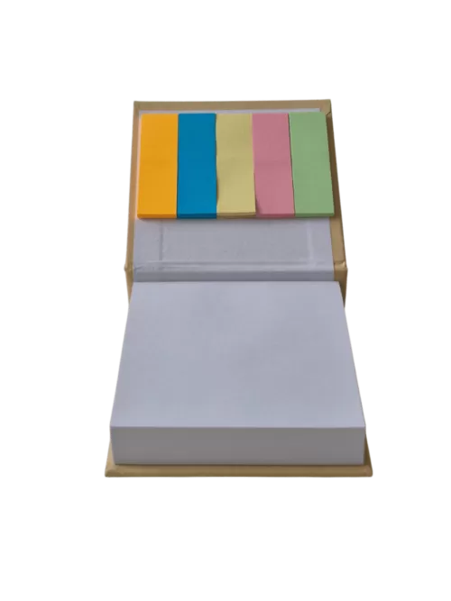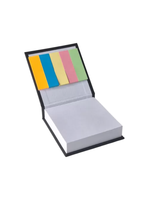 Taco para escritorio encuadernado tipo libro, en la tapa superior provee kit de señaladores. Contiene 100 hojas.