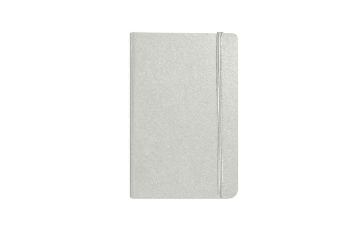 Tapa dura de color metalizada encuadernado lateral. Cantidad de hojas: 80 hojas lisas color marfil. Separador de tela, cierre elástico de color metalizado y bolsillo incluido. Ideal para regalos. Material: Cartón