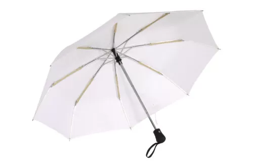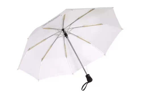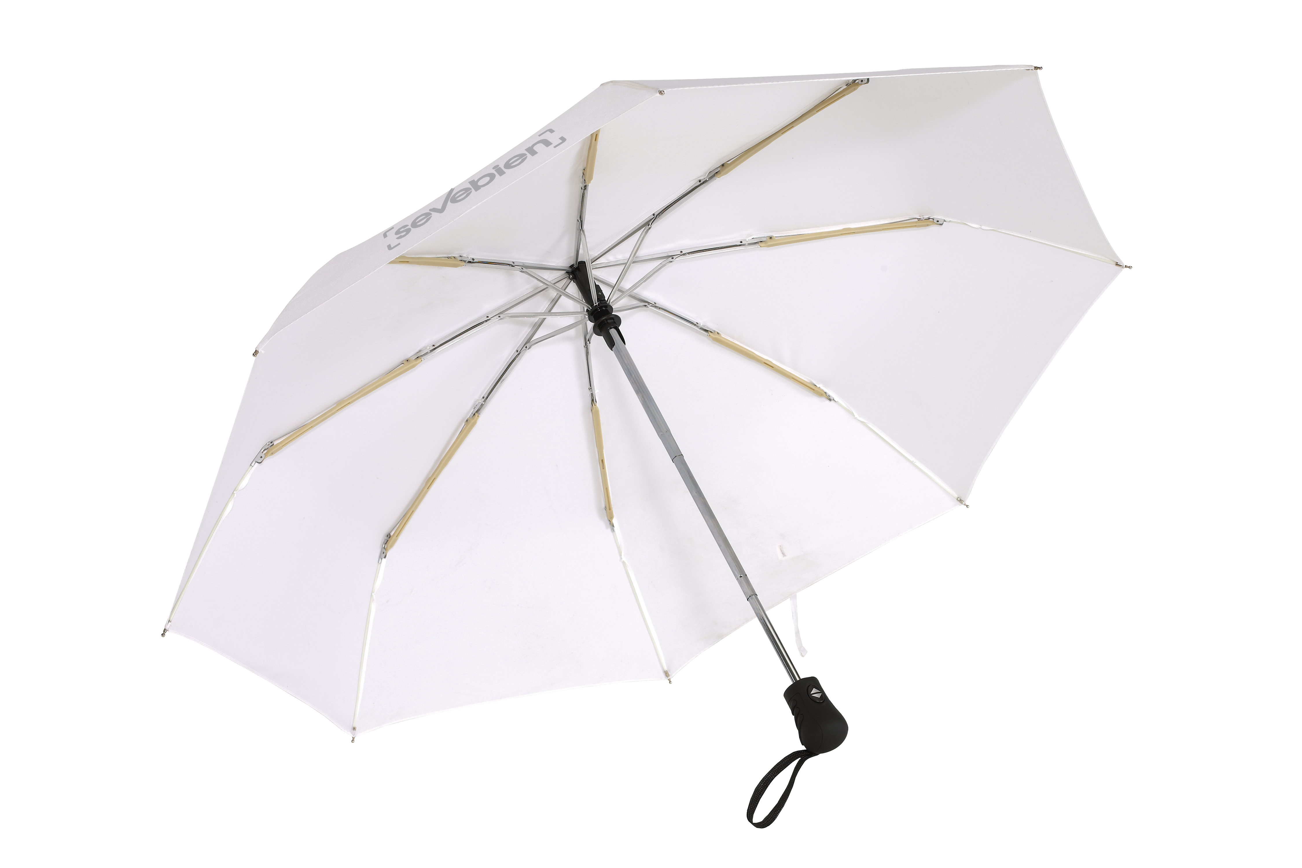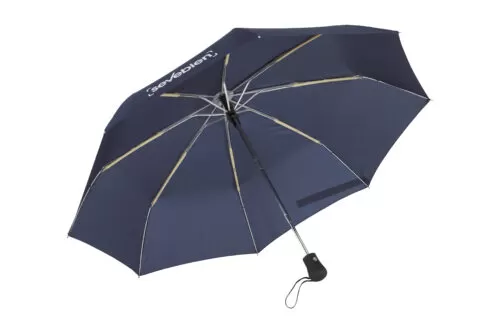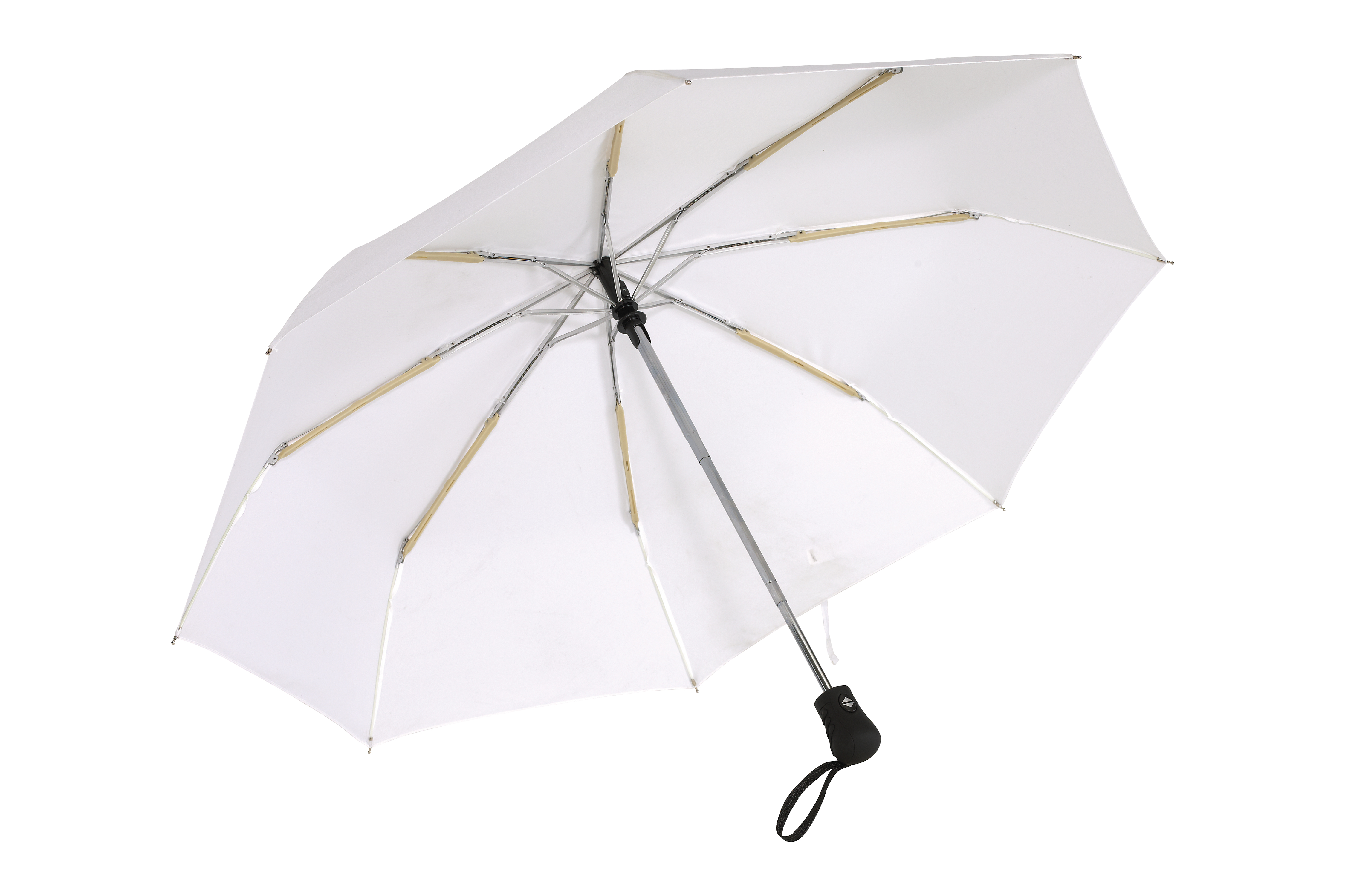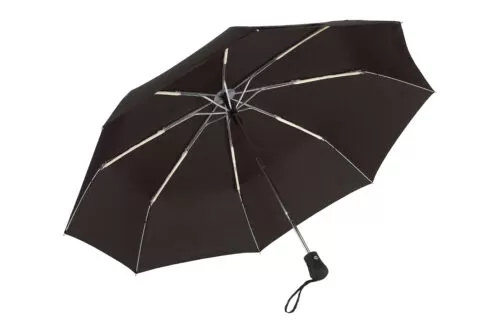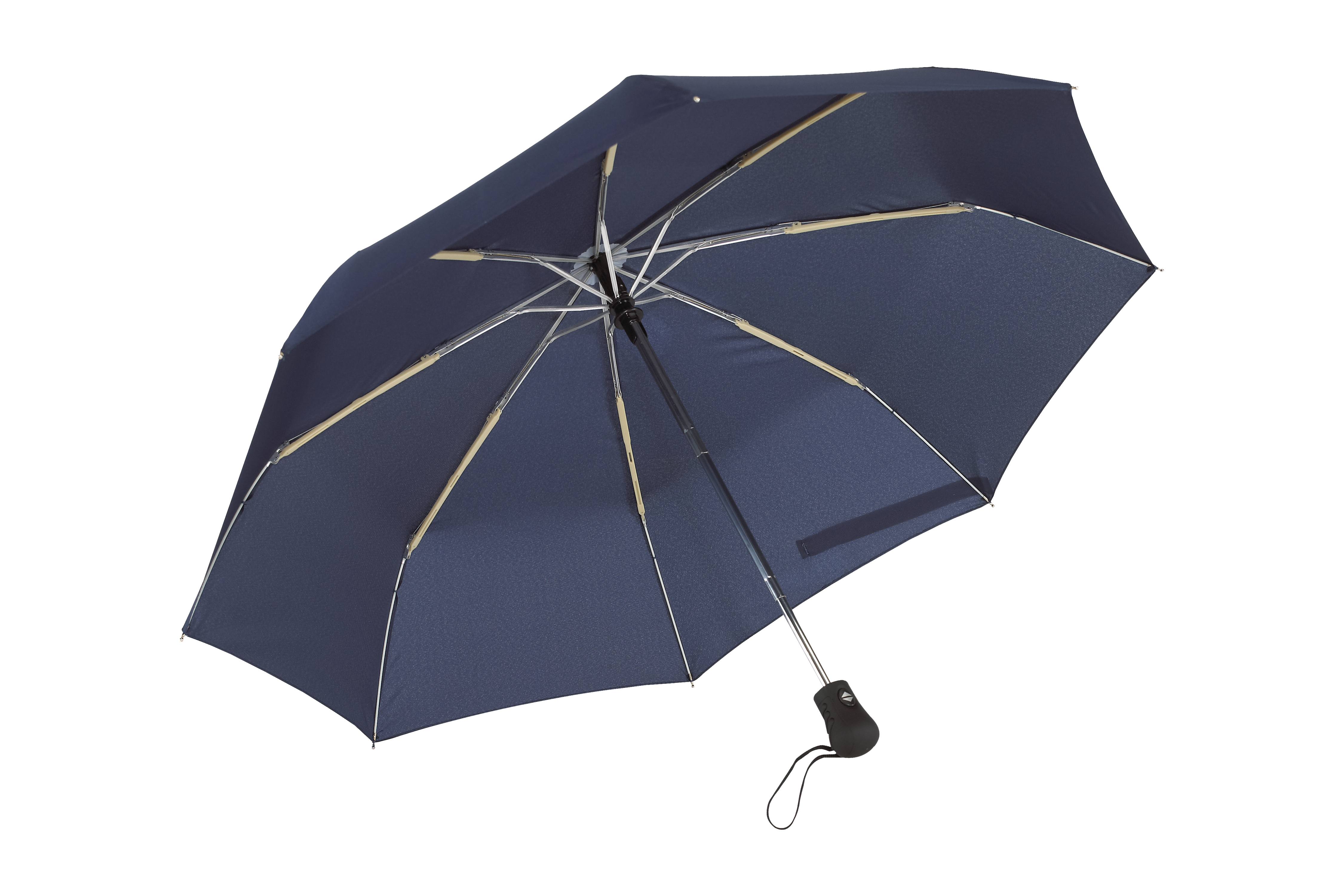 Ø 98 cm. 8 gajos. Ancho gajo 37 cm. Largo cerrado 28,5 cm. Largo abierto 55,5 cm. Poliéster, metal y plástico engomado. Paraguas APERTURA Y CIERRE AUTOMÁTICO. Eje y varillas metálicas. Mango de plástico engomado con correa cordón color negro. Botón a presión. Cubierta y funda en poliéster-pongee con revestimiento especial hidrófugo. Cierre con correa de velcro.