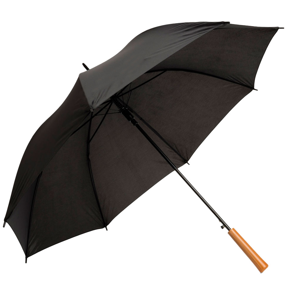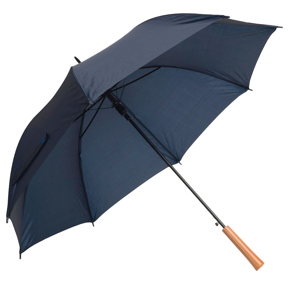 Ø 100 cm. 8 gajos. Ancho gajo 40 cm. Largo total 84 cm. Poliéster, metal y PVC. Paraguas APERTURA AUTOMÁTICA Y CIERRE MANUAL. Eje, varillas y punta metálicas y mango en PVC, símil madera. Botón a presión. Cierre con correa de velcro.