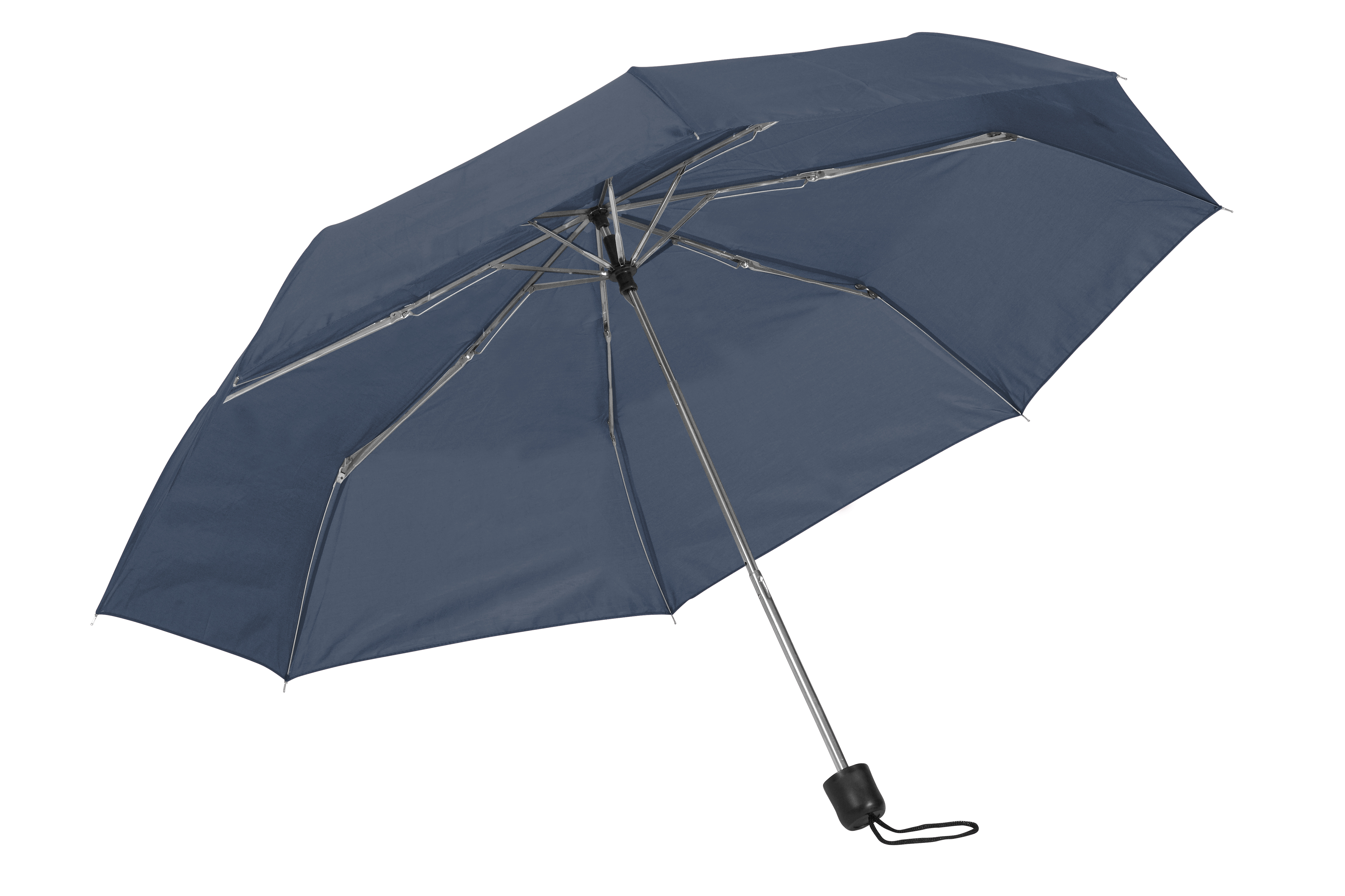 Ø 98 cm. 8 gajos. Ancho gajo 37 cm. Largo cerrado 24 cm. Largo abierto 54 cm. Poliéster, metal y plástico. Paraguas APERTURA Y CIERRE MANUAL. Eje y varillas metálicas. Mango de plástico negro con correa cordón color negro. Funda de poliéster. Cierre con correa de velcro.