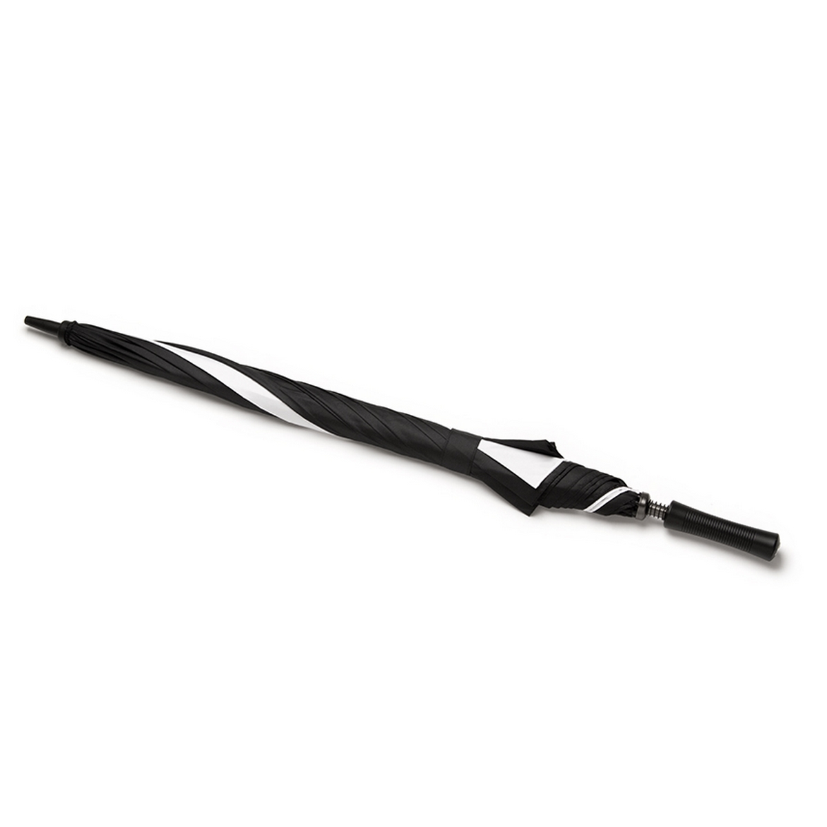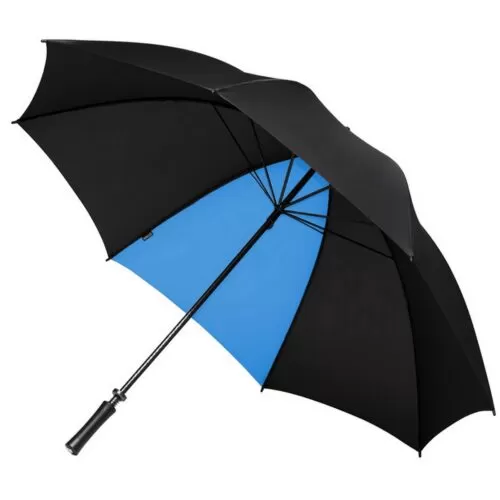 Paraguas ultra liviano de 8 paneles elaborado en fibra de vidrio con sistema WIND PROOF para evitar que fuertes vientos lo rompan. 7 gajos negros y 1 en color. Material: Pongee 190T. Medidas: 96 cm x diámetro 130 cm. Tahg.