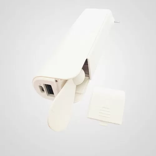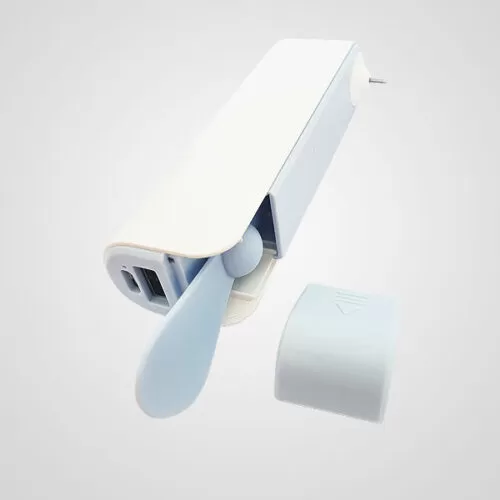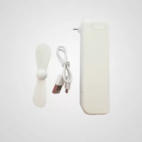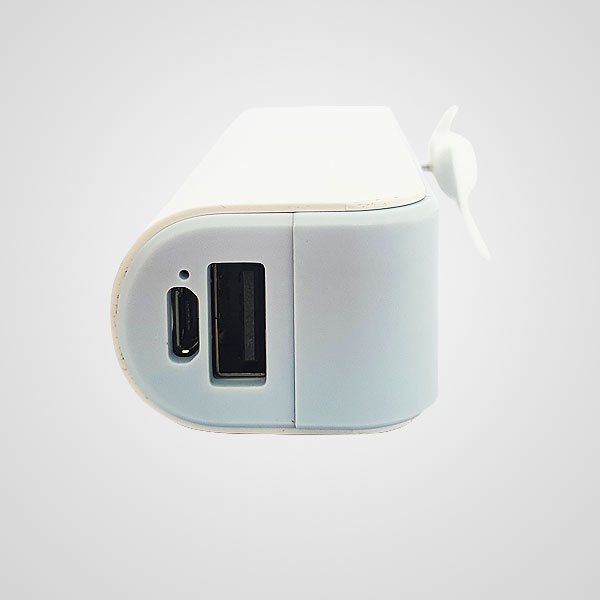 Descripción: Power bank con ventilador. Capacidad 2200mAh. Las aspas vienen dentro del equipo, posee dos velocidades. Incluye un cable de carga micro USB, posee un puerto USB de salida y puerto de carga.