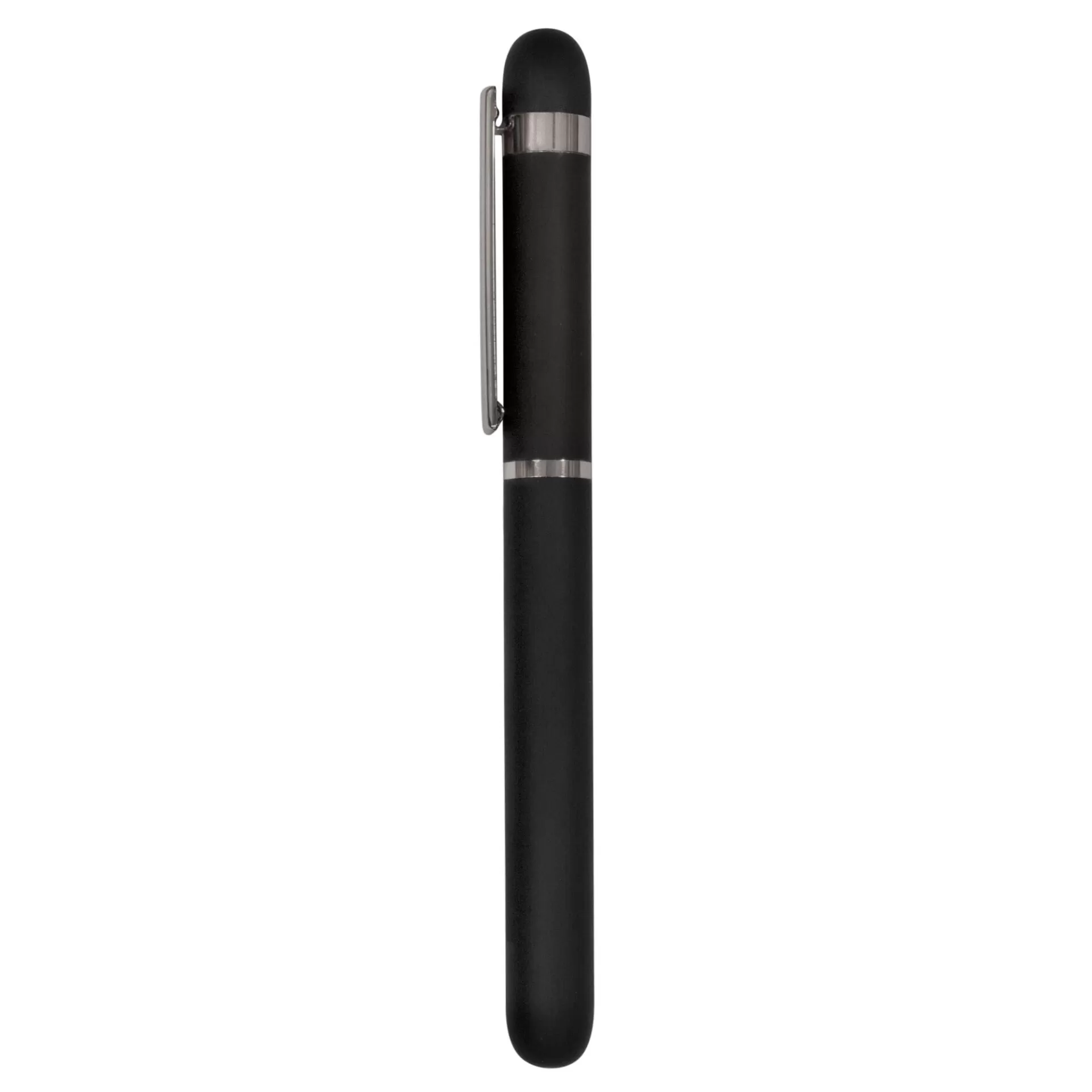Metal. Cuerpo de aluminio. Roller. Apertura con tapa a presión. Clip y anillos metálicos color plata. Tinta Negra. Destape electroplateado en ambas partes. Presentación en estuche con cierre magnético.