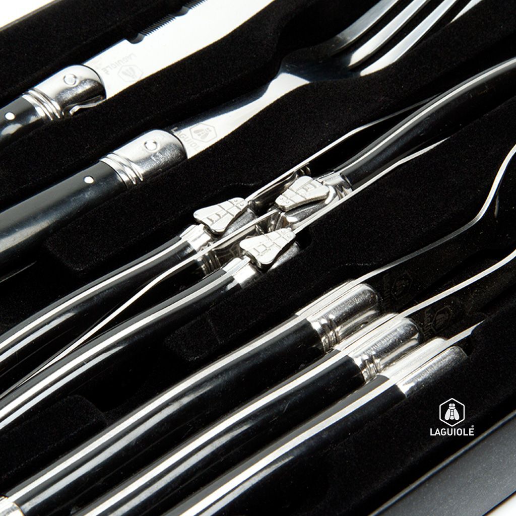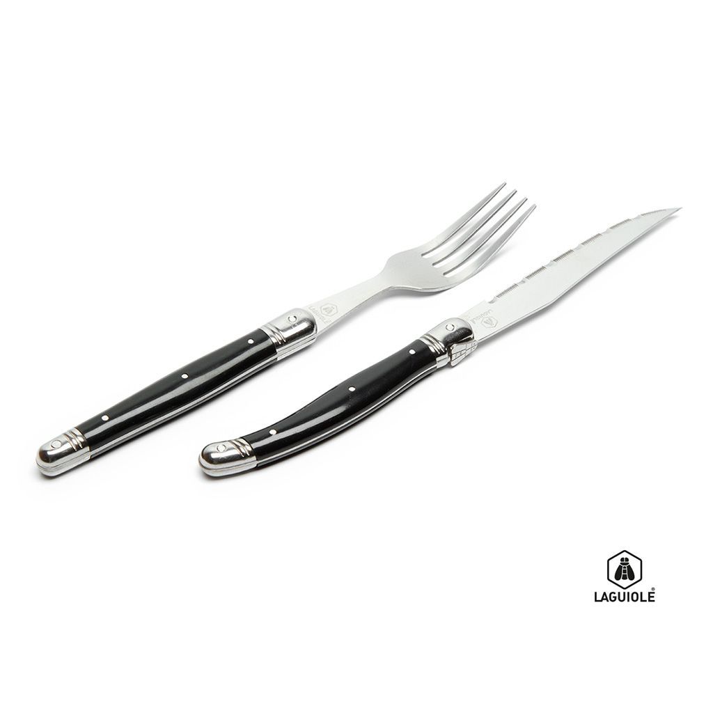 Set de 8 cubiertos, incluye 4 cuchillos y 4 tenedores. Hojas de acero forjado 420 y mango ABS con detalles metálicos. Medidas de la caja: 28cm x 18cm x 3cm. Producto libre de BPA. Laguiole.