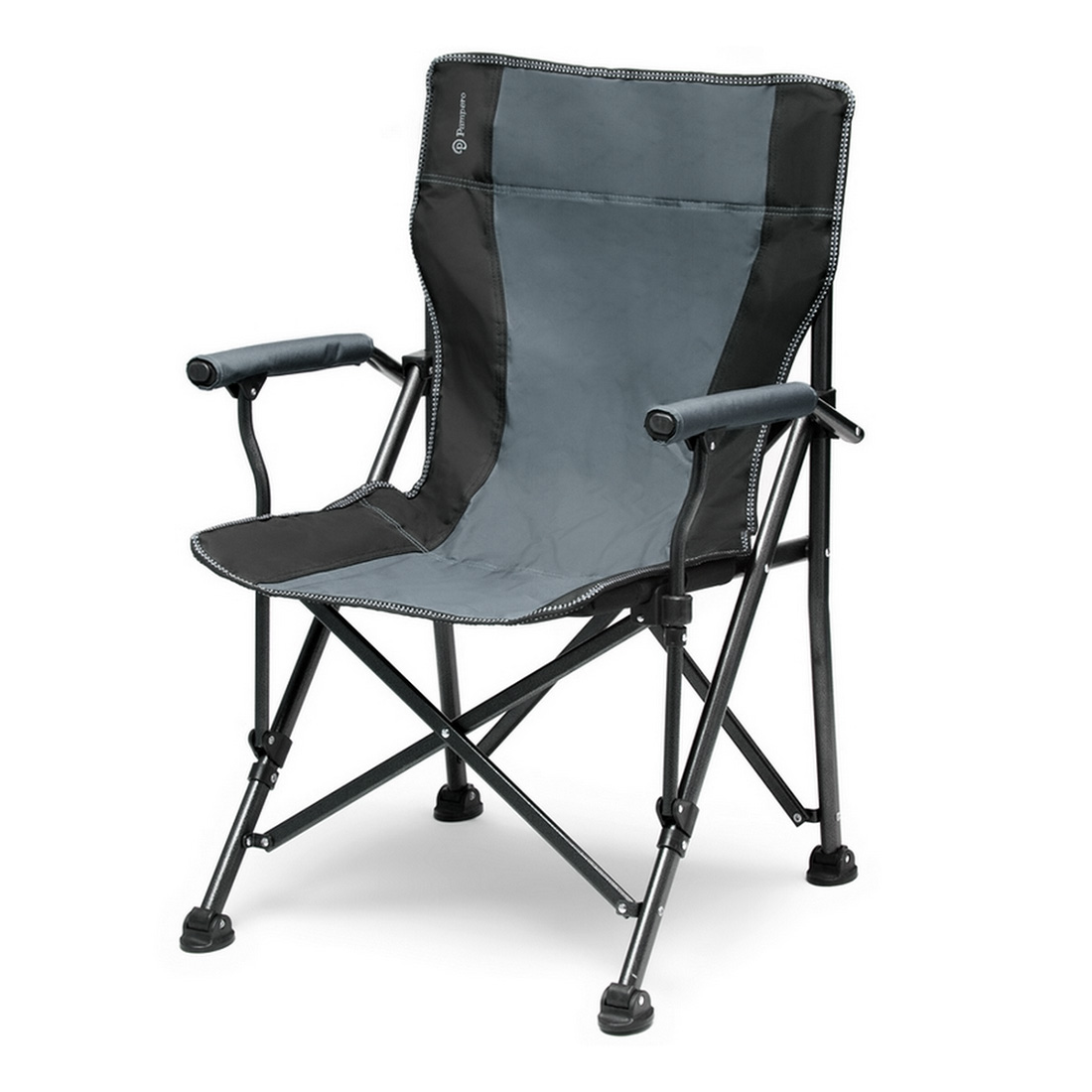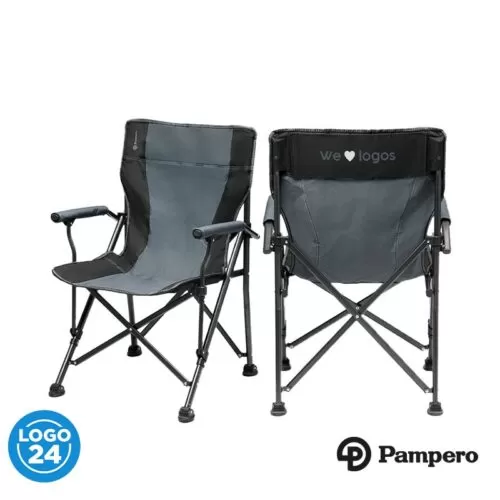 Silla plegable con Estructura reforzada con terminación epoxi rugosa. Paneles con interior de foam garantizando comodidad. Apoyabrazos acolchados. Bases adaptables a la superficie. Panel desmontable en el respaldo para logueo. Medidas: Ancho: 59cm, Profundidad: 55cm, Altura respaldo: 89cm. Pampero