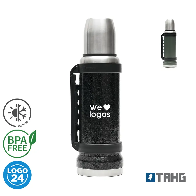 Termo de acero inoxidable 304, recubierto con esmalte especial que protege de ralladuras y golpes. Puede mantener el contenido a la misma temperatura durante 18hs, gracias a su doble pared aislante especial de acero. Cuenta con un tapón cebador Hermético a rosca con la función anti derrame y tapa con superficie plana estable para usar como taza o vaso y manija plegable para facilitar el transporte. Presentado en caja de cartón. Medidas del termo: 34 cm x 10,5 cm. Medidas de la caja: 35 x 11 x 11 cm. Capacidad: 1,1 Lts.