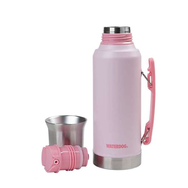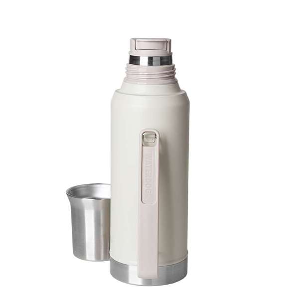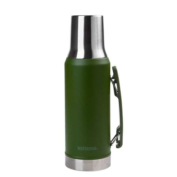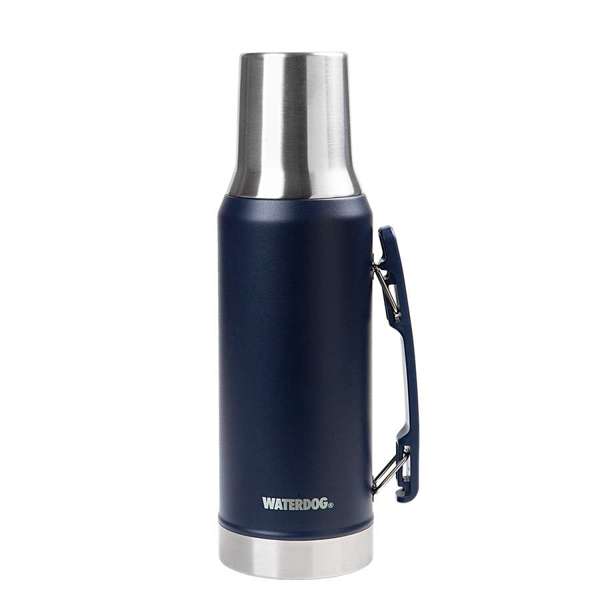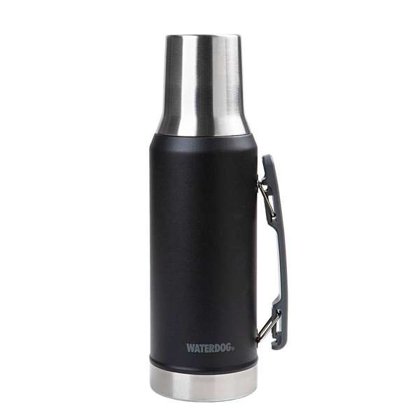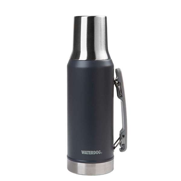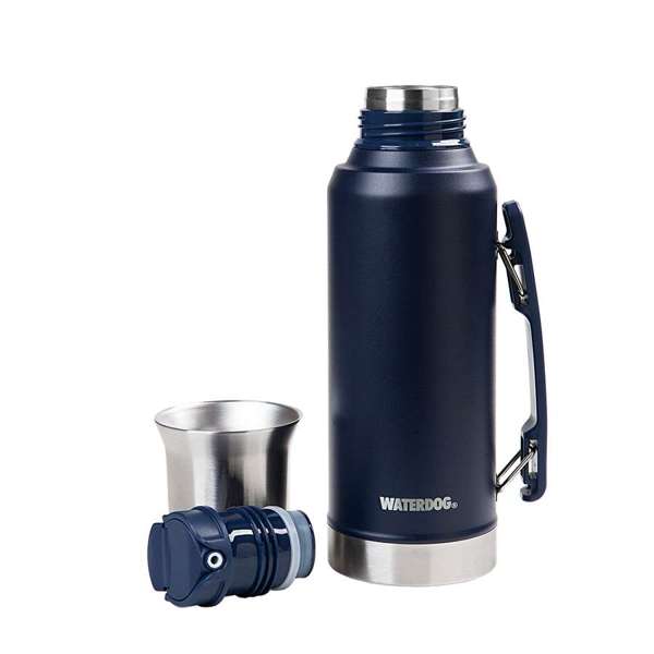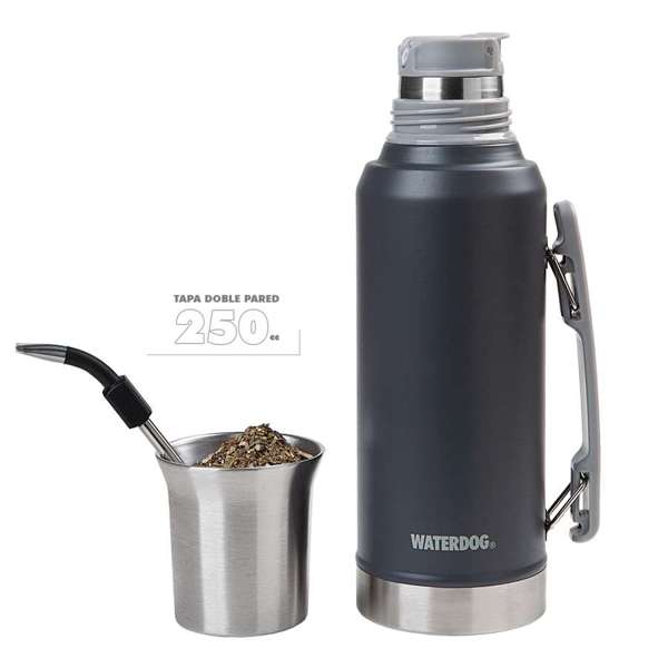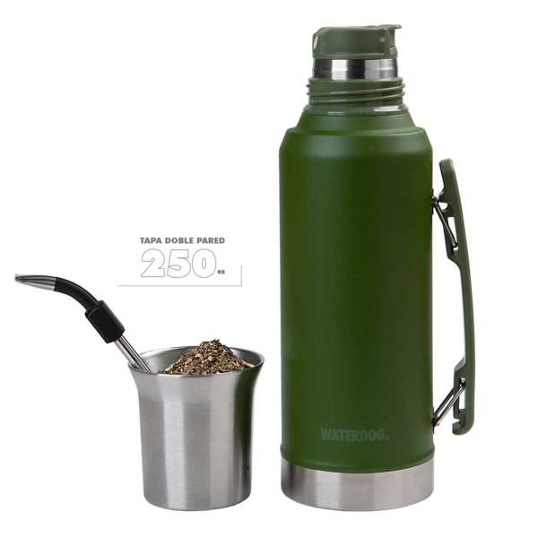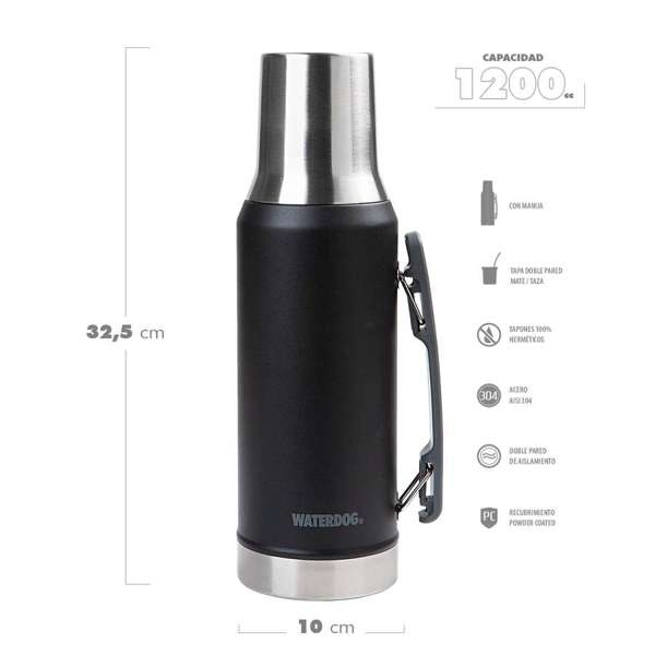 Termo Waterdog Ronda 1200. Composición: Acero AISI304. Aprobados por INAL. Capacidad: 1200ml. Alto: 32,5 cm. Peso: 0,820 kg. Diámetro base: 10 cm. Diámetro boca: 5,25 cm. Recubrimiento Power Coated. Doble pared aislante. Manija para transporte. Tapa doble pared de acero Aisi 304. Capacidad tapa 250 cc ideal mate o taza.