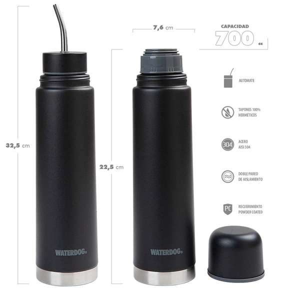 Termo doble función Waterdog Yunta700. Composición: Acero AISI304. Aprobados por INAL. Capacidad: 700 ml. Peso: 0,430 kg. Diámetro base: 7,5 cm. Diámetro boca: 4,5 cm. Alto con tapa: 22,5 cm Alto con bombilla: 32,5 Recubrimiento Power Coated. Vaso contenedor para yerba acero AISI304. Bombilla superior para mate acero AISI304. Bombilla inferior para mate acero AISI304. Tapa a rosca acero AISI304. Tapón 360° cebador.