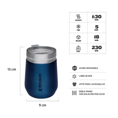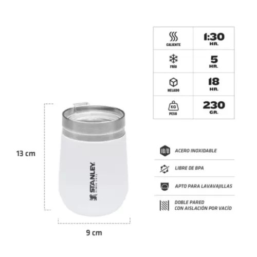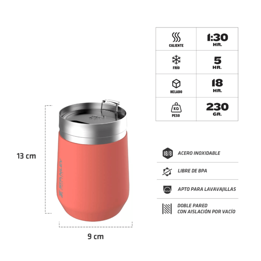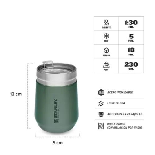 Ideal para café con leche matutino, bebidas frias y cualquier bebida intermedia, este vaso de tamaño perfecto se convertirá en su favorito de todos los días. El aislamiento al vacío de doble pared mantiene el vino, los cócteles y el café a la temperatura ideal. La construcción de acero inoxidable resistente no solo es duradera, sino que también mantiene sus bebidas cálidas hasta 1 hora y frías hasta 5 horas. Ademas, es libre de BPA y fácil de limpiar. El Vaso Stanley Everyday es una herramienta perfecta para llevar a donde quiera que vayas.